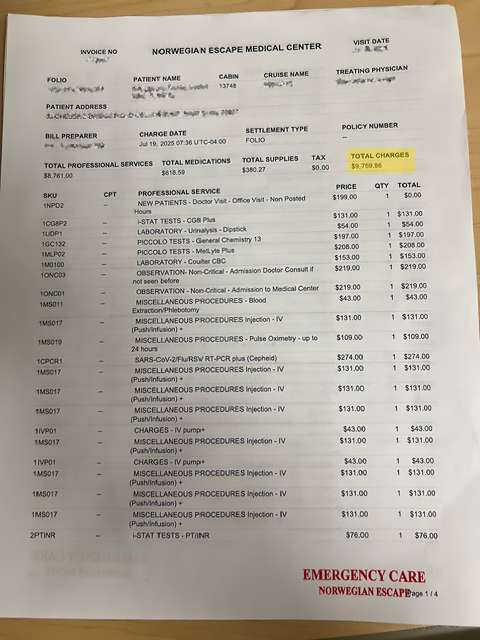 According to the breakdown, the bulk of the cost — about $8,761 — came from 21 separate medical tests. Medications added another $618.59, while supplies tacked on $380.27. The exact illness wasn’t disclosed, but the extensive testing suggests it wasn’t a minor case of seasickness.