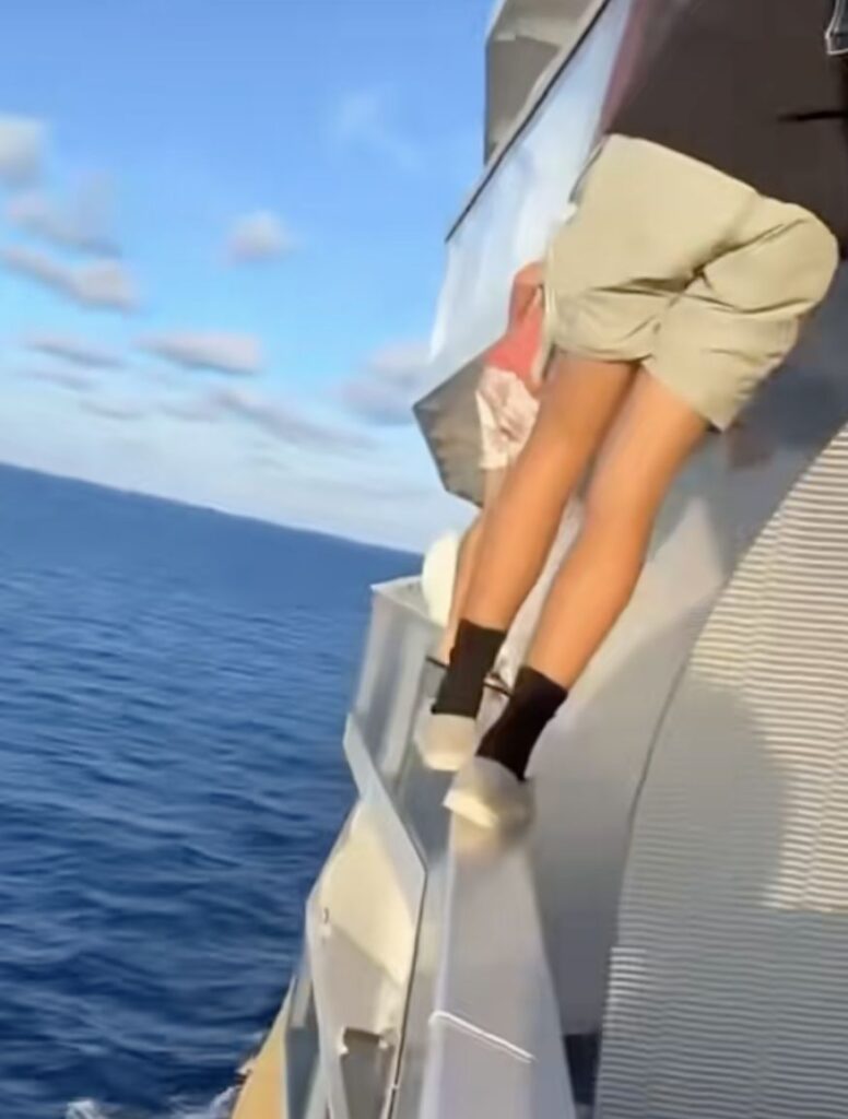 A viral TikTok video captured two teenagers recklessly climbing between balcony cabins while the ship was sailing in open water — hundreds of feet above the ocean.